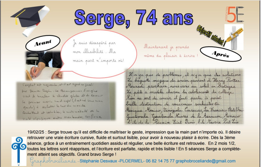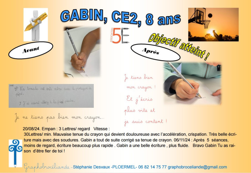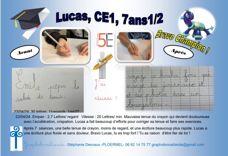 Au terme des 5 à 8 séances, si les objectifs sont atteints, la rééducation se termine et l'élève repart avec un diplôme et son crayon d'or. C'est un moment fort car le challenge est réussi ! Il y a fierté et émotion, surtout si l'écriture était un vrai frein. Désormais, il est capable de mettre en application quotidiennement les nouvelles habitudes d'écriture. Une fois cet automatisme mis en place, l'élève est alors complètement disponible en classe pour les différents apprentissages. N'oublions pas que l'écriture manuscrite renforce la mémoire, les connexions neuronales, et est un atout puissant pour l'apprentissage de l'orthographe, la lecture...