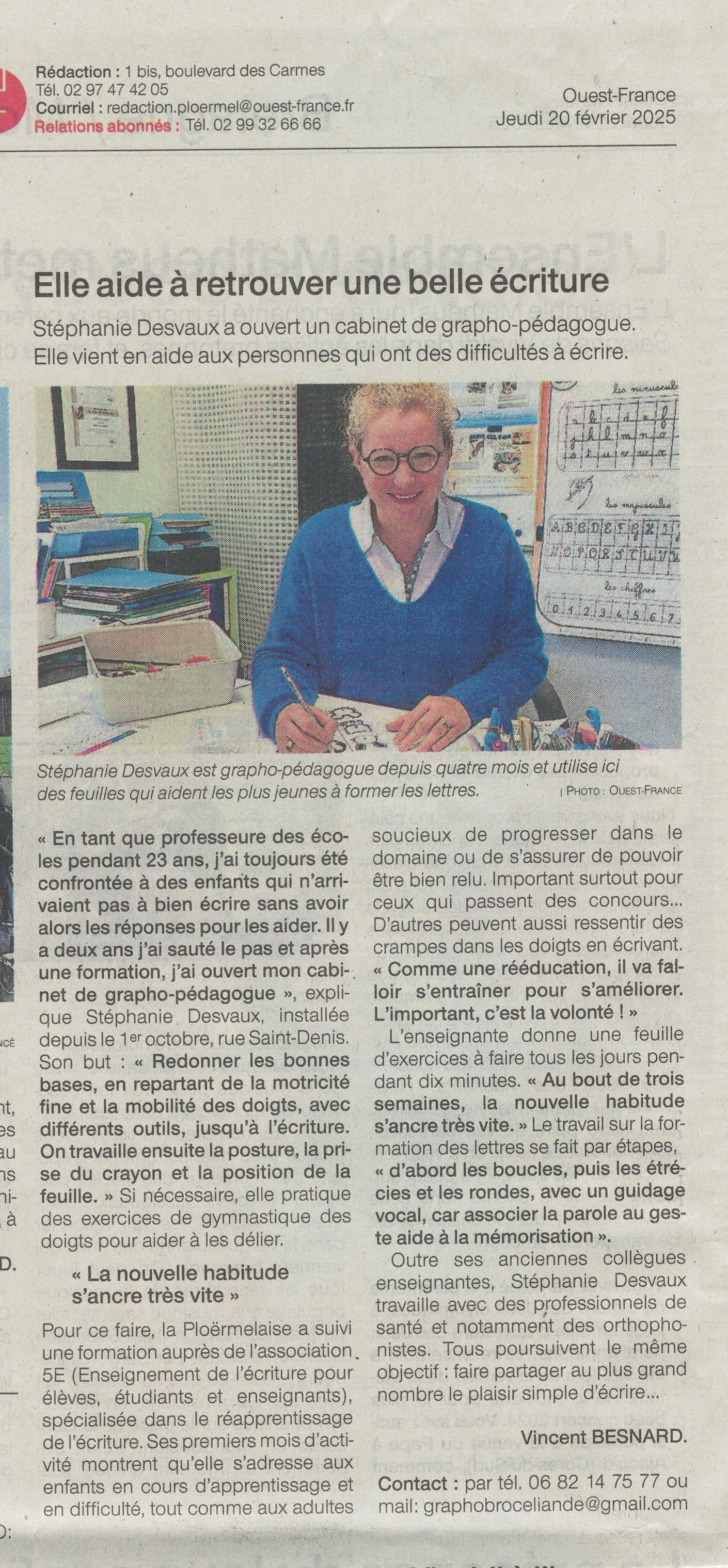 Je suis une spécialiste de l'écriture manuscrite, après avoir été professeur des écoles durant 23 ans. Aussi bien en maternelle qu'en élémentaire, je constatais des difficultés d'écriture croissantes. Les élèves dysgraphiques sont de plus en plus nombreux. J'ai donc décidé d'approfondir mes connaissances dans ce domaine pour leur venir en aide. L'Association 5E m'a formée, et je suis désormais spécialisée dans le réapprentissage de l'écriture. J'ai élargi mon domaine de compétences et apporte une aide ciblée à un plus grand nombre d'élèves (de tout âge) dans toutes les difficultés liées à l'écriture : douleurs, lenteur, illisibilité, manque de fluidité...