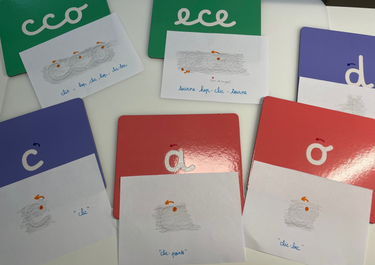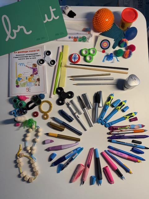 Chacun ayant des besoins différents, les exercices sont ciblés. Quels que soient les objectifs, on reprend toujours les bases et on suit la progression. L'écriture ne se limite pas à la trace écrite ou la tenue du crayon, c'est un ensemble. D'où la nécessité de (re)travailler : motricité fine, posture, tenue de crayon, choix de l'outil scripteur, formation des lettres, puis vitesse. Le guidage vocal 5E fait partie intégrante de cette rééducation. En ajoutant du "son" au geste et au sens, l'ancrage est beaucoup plus profond. Les 3 composantes : motrice (geste), symbolique (son) et sémantique (sens) de l'écriture sont ainsi réunies et permettent mémorisation et apprentissages. Les exercices proposés sont souvent ludiques, avec des petits accessoires pour les plus jeunes afin de les motiver. L'important c'est la régularité de l'entrainement, qui favorisera une réussite rapide et pérenne.