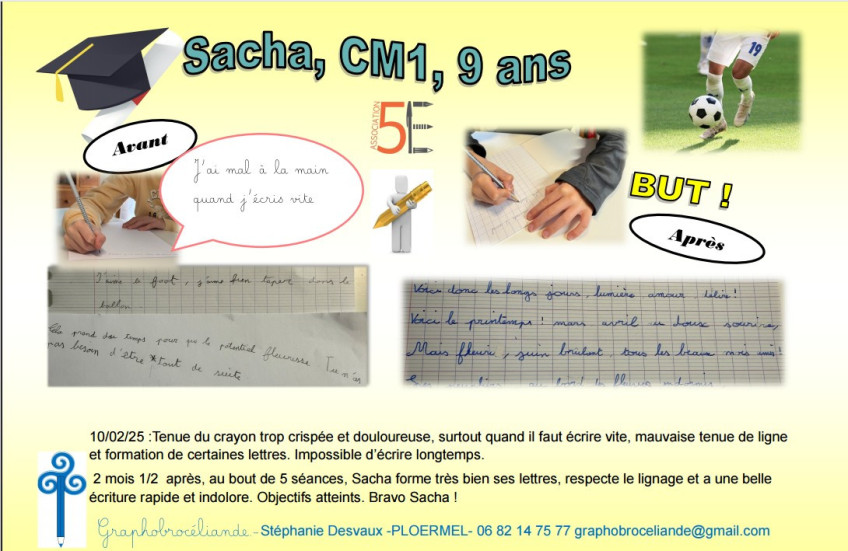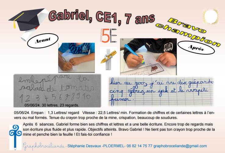 Au terme des 5 à 8 séances, si les objectifs sont atteints, la rééducation se termine et l'élève repart avec un diplôme et son crayon d'or. C'est un moment fort car le challenge est réussi ! Il y a fierté et émotion, surtout si l'écriture était un vrai frein. Désormais, il est capable de mettre en application quotidiennement les nouvelles habitudes d'écriture. Une fois cet automatisme mis en place, l'élève est alors complètement disponible en classe pour les différents apprentissages. N'oublions pas que l'écriture manuscrite renforce la mémoire, les connexions neuronales, et est un atout puissant pour l'apprentissage de l'orthographe, la lecture...